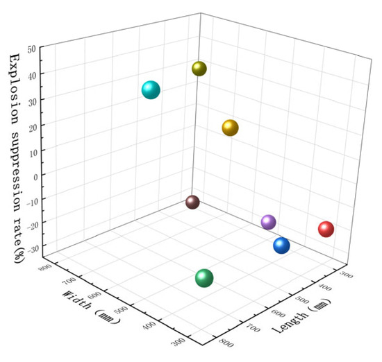 The shock wave rejection rates for various explosion chamber diameters are shown in Table 2. Figure 12 plots the shock wave rejection rate against the explosion chamber’s length and breadth. As shown in Table 2, the peak shock wave overpressure has been suppressed by the 5–5, 5–8, and 8–5 explosion chambers, while it has been augmented by the 3–3, 3–5, 3–8, 5–3, and 8–3 explosion chambers. According to our group’s previous research findings, the shock wave suppression rate is influenced by both the length and width of the explosion chamber. Table 2 and Figure 12 show that 5–5, 5–8, and 8–5 have strong shock wave suppression effects.