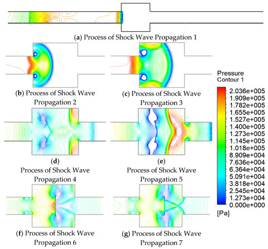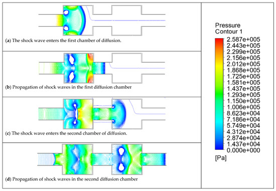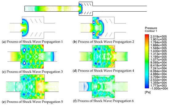 - The energy of the backward propagating shock wave is rather considerable, as seen in Figure 22e. The reverse shock wave continues to move in the opposite direction after the forward shock wave cancels it out, creating a sparse wave at the outlet. The complicated cancellation, reflection, and superposition caused by the muffler plate and explosion chamber significantly weaken the shock wave.