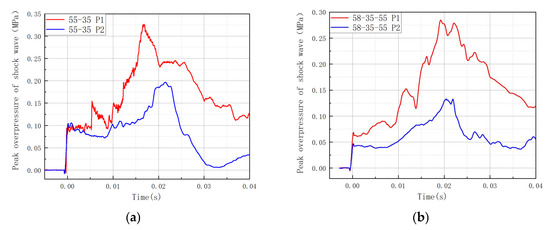 The test results for the multi-stage tandem explosion chamber are displayed in Figure 15. In the 55–35 two-section tandem explosion chamber depicted in Figure 15a, the peak overpressure at the P1 measurement point was 0.3278 MPa. The peak overpressure at the P2 measurement point was 0.1976 MPa, with an explosive suppression rate of 39.72%. The peak overpressure at the P1 measurement point is 0.2844 MPa, the peak overpressure at the P2 measurement point is 0.1326 MPa, and the explosion suppression rate is 53.37% for the 58–35–55 three-stage tandem explosion chamber depicted in Figure 15b. The 55 explosion chamber, for instance, has a peak overpressure suppression rate of 21.48%. Peak overpressure suppression rates increased for the 58–35–55 three-stage tandem explosion chamber by 31.89% compared to the 55 single-stage explosion chamber, the 58–35–35 two-stage tandem explosion chamber by 18.72% compared to the 55 single-stage explosion chamber, and the 55–35 two-stage tandem explosion chamber by 13.65% compared to the 55–35 two-stage tandem explosion chamber.