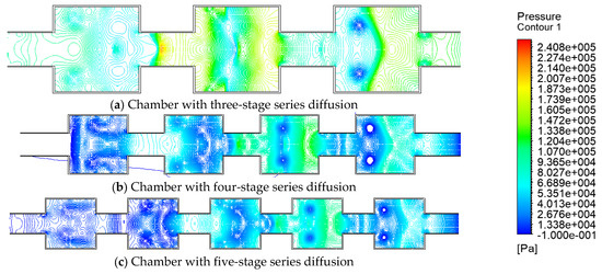 The shock wave’s progression through the multilayer explosion chamber is seen in Figure 19. Three-stage tandem explosion chambers are shown in Figure 19a, four-stage tandem explosion chambers are shown in Figure 19b, and a five-stage tandem explosion chamber is shown in Figure 19c. As illustrated in Figure 19, each single-stage explosion chamber inside the multi-stage tandem explosion chamber has a wave dissipation mechanism comparable to that of the single-stage cavity, and each portion of the explosion chamber can help dissipate the shock waves progressively. All subsequent diffusion chambers were unable to sufficiently attenuate the shock wave since the shock wave had already been greatly reduced by the first three diffusion chambers. Thus, employing a three-section explosion chamber structure is advised while building or renovating human defense projects.