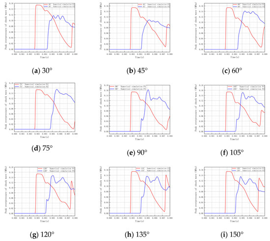 The explosion rapidly releases large amounts of energy and is more challenging to quantify. A 20% difference between the findings of the numerical simulation and the experiments is acceptable for engineering applications. As seen in Figure 13, which uses the peak shock wave overpressure at position P1 as an example, Figure 13a compares experimental and numerical simulation findings. The experimental result for P1 is 0.1611 MPa, whereas the numerical simulation result is 0.1573 MPa, resulting in a 3.42% error. Figure 13b compares the findings from experimental and numerical simulations of the peak shock wave overpressure at position P2. The practical result for P2 is equivalent to 0.1525 MPa, whereas the result from the latter is 0.1489 MPa, resulting in a 2.36% error. The numerical simulation findings are regarded as credible since the error analysis reveals that the mistakes of the P1 and P2 measurement locations are less than 20%. Later, a more thorough investigation will be conducted using this numerical simulation parameter.