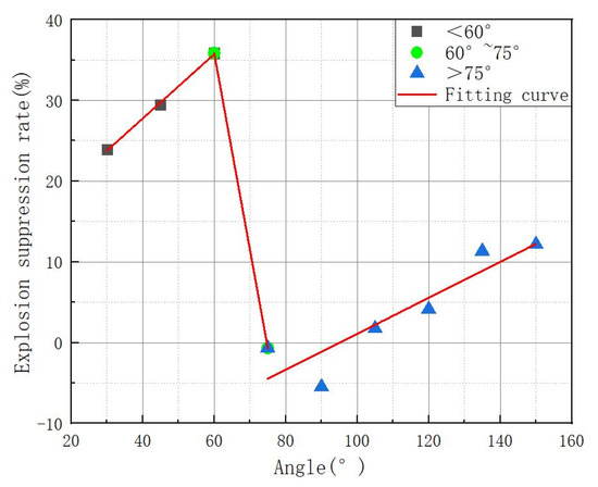 Due to building space restrictions, it is not possible to construct numerous explosion chambers in the restoration of existing human defense projects. As a result, the best possible design of the existing explosion chambers is crucial for enhancing the protection capacity. Since the silencer can cancel out sound waves, its structure serves as a guide for creating the explosion chamber’s ideal design. The outcomes of the numerical simulation of the explosion chamber for nine wave elimination plate angles are displayed in Figure 20. The link between the shock wave overpressure peak rejection rate and the wave elimination plate’s angle is seen in Figure 21. Figure 20 and Figure 21 demonstrate that the wave elimination plate’s impact at 60° is the best, with an inhibition rate of 35.85%, while its effect at 90° is the poorest, with an inhibition rate of −5.45%. The various wave elimination plate angles significantly impact the rate of explosion suppression. The law is consistent with the form of the segmentation function. The fitting equations for the different curves were created by using the following equations to fit the parts: