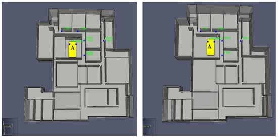 Also, for the analysis of FDS pool fire 3D results, geometry has been applied and modeling has been performed based on the location of the kerosene storage and drain tank. In Figure 1, B2 is the second basement floor and B1 is the first basement floor. The kerosene storage tank is located at A. The yellow box is the released kerosene pool, and the blue points represent the location of sprinklers. In the results page, the yellow box will be shown, but it is not a computational error and just means a kerosene pool. The room area is 218.96 and volume is 2300 . In B2, two doors exist in the storage tank room, and one door exists in B1, therefore, fire and smoke could be diffused to adjacent corridors. The thickness of each wall is 0.25 m and consists of concrete. Sprinklers are equipped on the ceiling and ventilation systems are installed. The room contains the storage and drain tank, and the kerosene storage tank volume is 70 and the drain tank volume is 3 . The whole building height is 16.5 m and it is assumed that the lowest location is 0 m. Thus, B2’s floor is 5.5 m and B1’s floor is 11 m. Finally, for the sprinkler system, water spray was used with the following settings: sprinkler activation temperature of 74 degrees, velocity of 5, flow rate of 80, and a height of 10.5, and simulations were conducted.