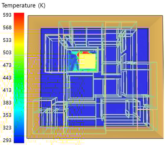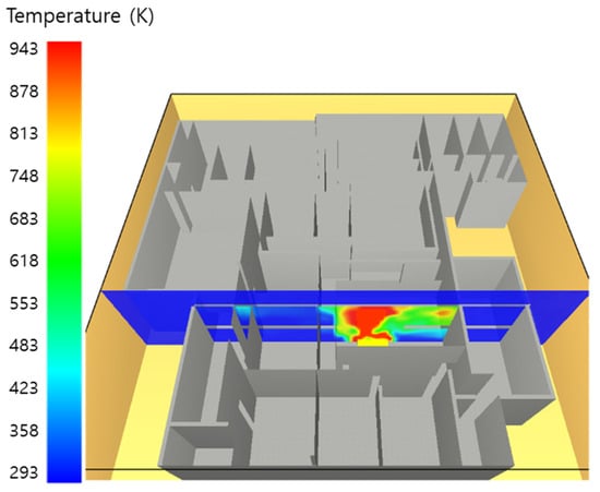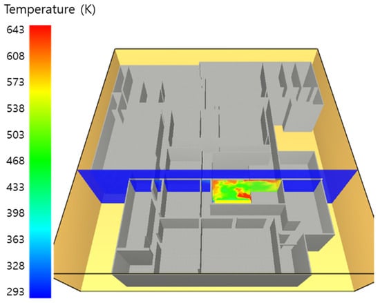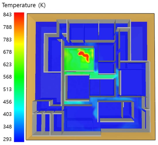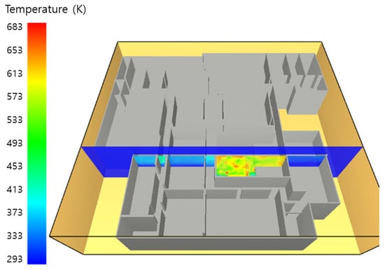 Figure 6 and Figure 7 show the kerosene storage room temperature after 60 s and 220 s, and Z is 6.5 m (B2 bottom height is 5.5 m). After 60 s, the hottest plumes are detected, and through adjacent corridors, plumes are dispersed to 3 o’clock and 6 o’clock directions. After 220 s, the plumes are dispersed in the 12 o’clock direction. The plumes are hotter than the ambient air, therefore, they rise due to convection because the XY plane temperature range is 600–900 K, and the YZ plane temperature range is 400–600 K.