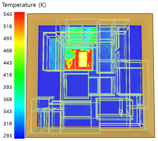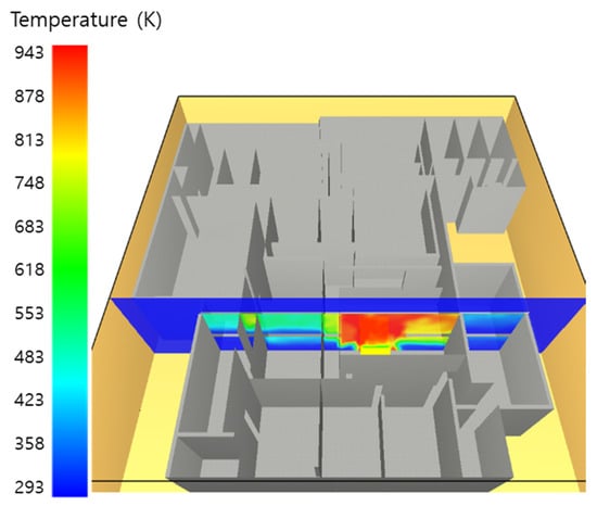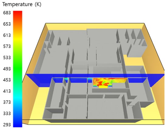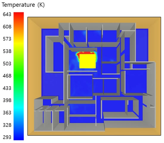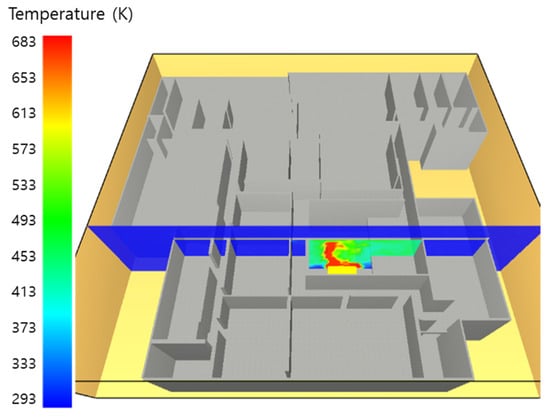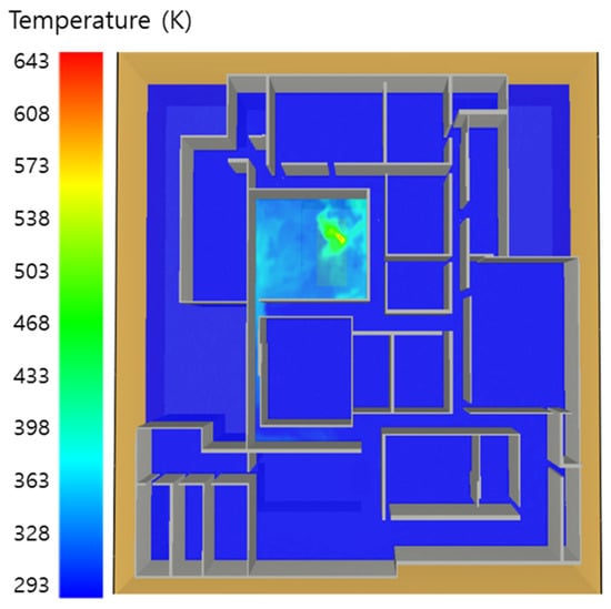 Figure 19 and Figure 20 show the storage room temperature. After 60 s, the maximum temperature of the plumes extends over 800 K, but due to the lack of air, the temperature dropped to 500 K and the ambient plumes were removed. In Figure 21 and Figure 22, the temperature shift is shown at B2. After 60 s, the plumes dispersed to the 6 and 12 o’clock directions, and after 270 s, the whole floor temperatures of B2 were increased, more than 350 K.