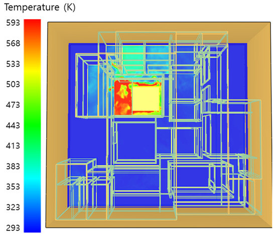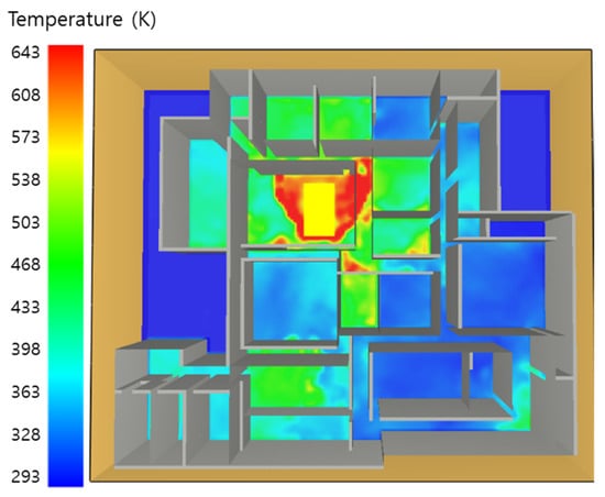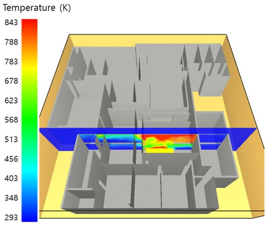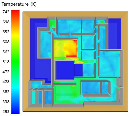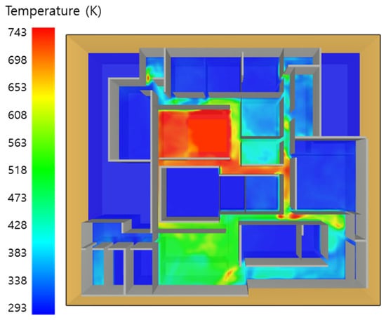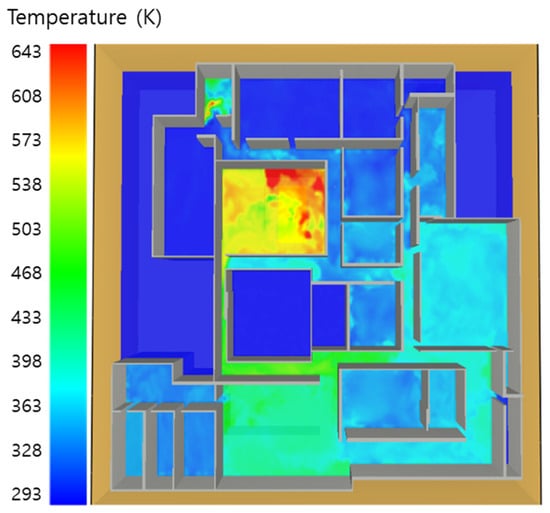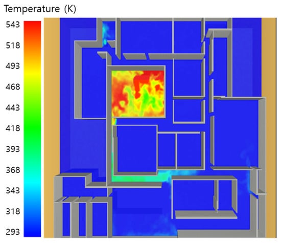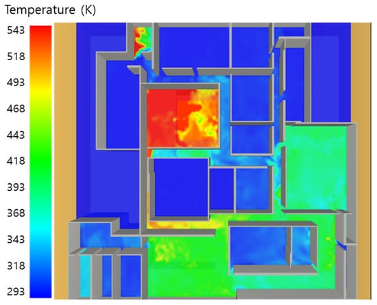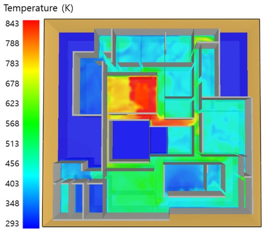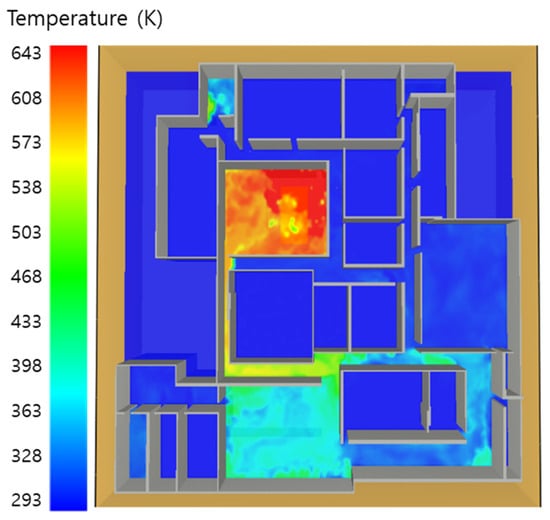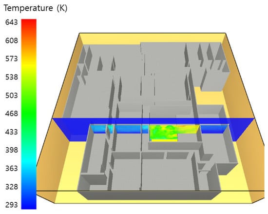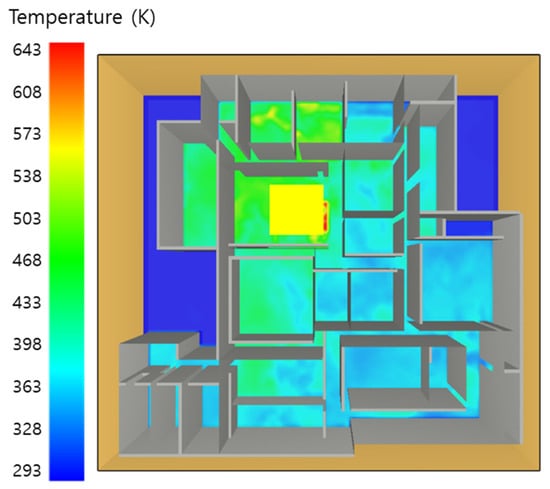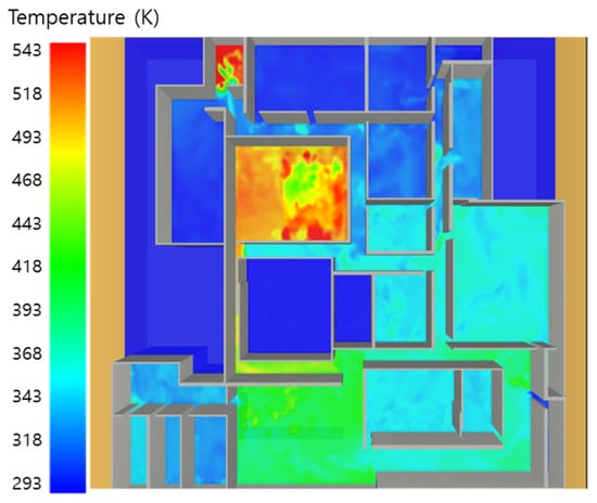 Figure 14 shows the storage room temperature. At B2, the temperatures drop to 500 K, but the plumes were condensed by the water mist; therefore, the diffusion velocity dropped and was stuck on the bottom. Figure 15 shows that the plume diffused to 6 o’clock corridors after 30 s but, due to the sprinkler, the temperature and diffused areas decreased than that shown in Figure 6. The plumes shown in Figure 16 dispersed to the adjacent corridors and rooms, as previously shown in Figure 7. Finally, the plumes dispersed to the whole of B2 & B1 and increased the temperatures up to 400 K. However, the plumes are stuck by the vortex, as shown in Figure 17, and the southernmost and easternmost room temperatures were recorded at 150–200 K higher than the surrounding corridors and rooms.