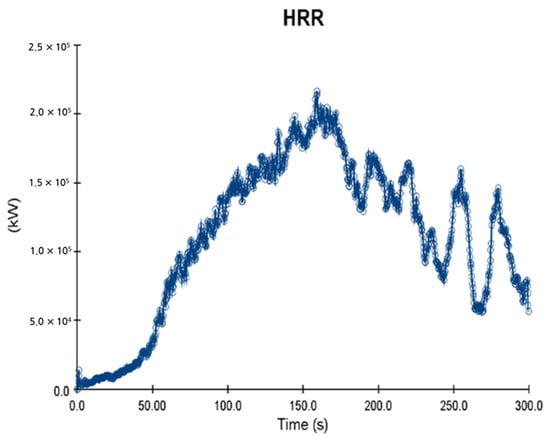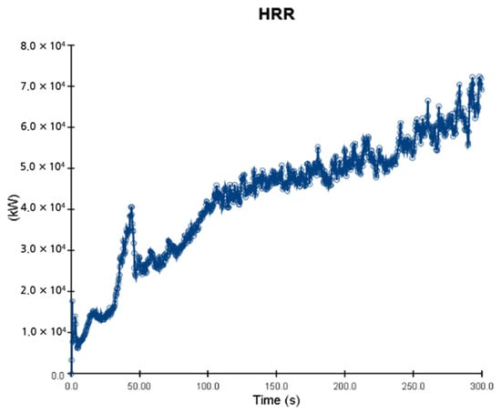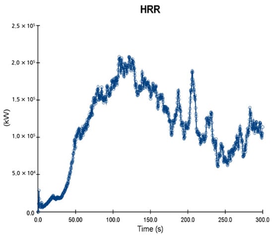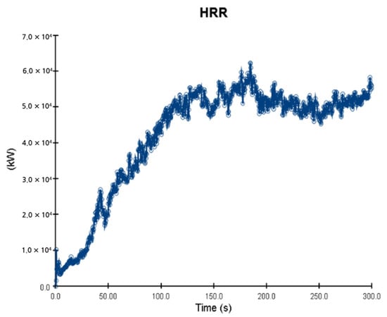 Temperature and HRR (heat release rate per unit volume) are the primary factors that damage buildings and are directly related to the failure of buildings and death. The plume produced by the pool fire includes flame, soot and smoke, and the HRR indicates the size of fire and amount of heat. Each material has a different resistance to thermal damage, distinct failure temperature and heat. If the plumes that caused the pool fire accident are retained for a long time, the total heat per unit volume of the plumes will increase due to their increasing temperature. Then, when the distinct failure temperature and heat resistance are exceeded, the building structure will be destroyed by thermal damage [,,,]. Through HRR and temperature changes, we can predict and estimate the resistance of the building and thermal damage. The fire risk is determined by a combination of factors, including combustibility, the amount of heat released during combustion, heat release rate, flame spread, and smoke. The heat release rate determines the intensity of the fire, and has an important role in controlling fire hazards []. Fire risk predicts the evacuation safety throughout a tall building. Therefore, it is essential to input the heat release rate. Additionally, since temperature and heat release rate have a close relationship where the heat release rate decreases as the temperature decreases, it is considered reasonable to perform an analysis factor involving temperature and heat release rate in this study [,,].