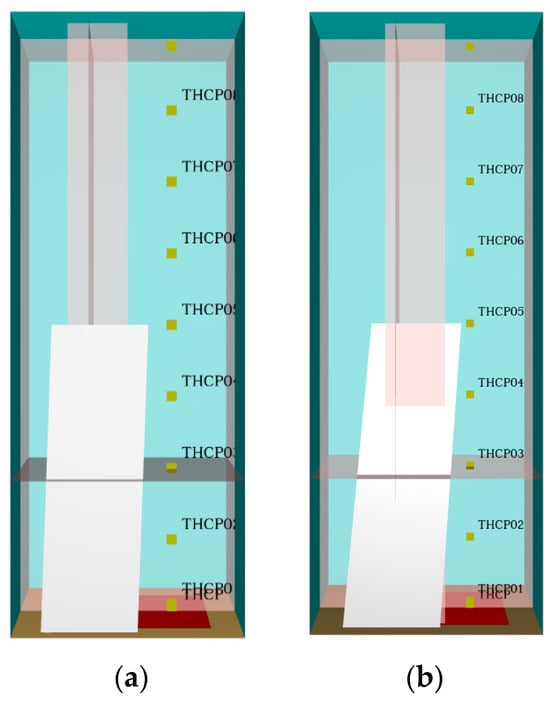 The total combustion area under the three scenarios is the same about 130 m2, which is the bottom area inside the pylon column. The unit heat release rate of the foam is 0.273 MW/m2 []. The time history curves of HRR for the different scenarios are given in Figure 3. The trend of the three curves is basically coincident. Therefore, it is proved that the fire source setting is the same and effective. It can be seen from Figure 3 that the HRR increases rapidly in the first 76 s, and then the HRR remains stable. This phenomenon is consistent with the development model of t2 fire. The total simulation time is 1800 s.