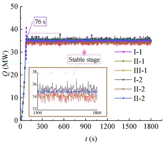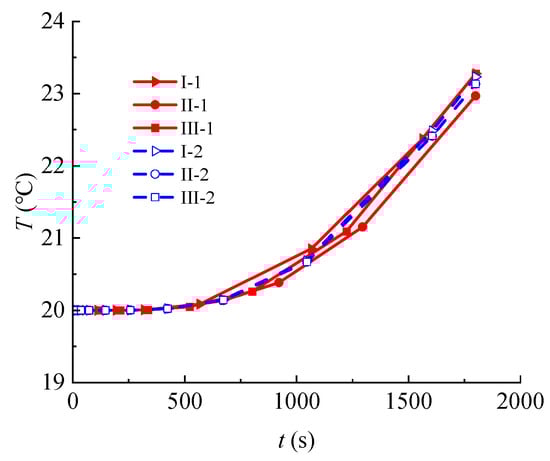 Heat transfer after temperature loading: (a) I-1, (b) II-1, (c) III-1, (d) I-2, (e) II-2, and (f) III-2.
