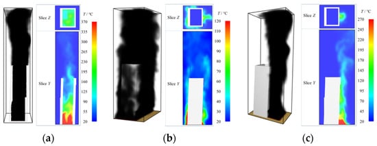 Temperature and smoke distribution of SP at 205 s: (a) I-1, (b) II-1, and (c) III-1.