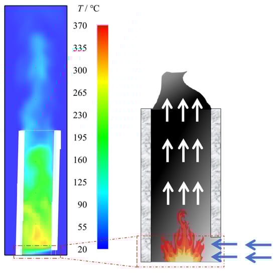 In the simulation model of an internal fire, a worker manhole with a height of 2 m is added to the inner wall of the pylon. The hot smoke is floated via buoyancy from bottom to top, as shown in Figure 5. Due to the effect of internal and external pressure difference, the air outside the pylon is pushed into the fire space through the bottom lateral channel at a certain velocity. The combustion of the fire source is enhanced by supplemental oxygen. The fire plume is driven by buoyancy and starts to rise. With the continuous supplement of fire source energy and the continuous entrainment of external air into the pylon column, the volume of flue gas and air is increased after full mixing. Meanwhile, the gas mixture is gradually lifted under the driving buoyancy. During the rising process, the air is continuously mixed and involved, gradually filling the inside of the pylon column. After the column is filled with smoke, the gas in the column gradually reaches an equilibrium state. The external gas is involved in the bridge pylon from the bottom holes, and the internal gas is discharged from the top opening vent. Under the continuous buoyancy drive and chimney effect [,], the flue gas in the bridge pylon is maintained stable without changing with time during the flow, which is a stable stage.