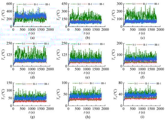 Thermocouple temperature results: (a) T1, (b) T2, (c) T3, (d) T4, (e) T5, (f) T6, (g) T7, (h) T8, and (i) T9.