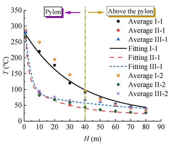 Under the same height condition, ignoring the difference in inclination angle, the SP and MP are only different in size. Scenarios I-2, II-2, and III-2 of the MP column are established to verify the effectiveness of Equation (2). Then, the calculated temperature values are basically similar to those in Scenario I-1 of SP, as shown in Figure 7. The results are consistent with the trend of negative exponential decline and highly resemble the fitted curve. Consequently, the fire temperature distribution of the MP and SP can be considered consistent, thus simplifying the temperature load boundary.