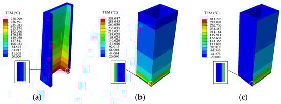 The pylon column model is established in the finite element (FE) software, with a size that is the same as that of the pylon column model in FDS. The FE models are meshed using structured grids. In order to improve the calculation speed of FE simulation, the models are reasonably divided. For the facing-fire surface, the meshed elements are denser in the thickness direction with a grid size of 0.025 m. At the same time, the elements of the back-fire part are rougher, and the size of the grids is 0.4 m. The number of grids per scenario is listed in Table 2. The dense positions of the model are one circle inside Scenario I, one circle outside Scenario II, and one side outside Scenario III. The types of thermal and mechanical calculation elements are DC3D8 and C3D8R, respectively. The bottom of the bridge pylon is set as a fixed constraint during mechanical calculation. The ambient temperature is 20 °C. The calculation time is 1800 s. The similarity of the temperature field in the MP and SP has been confirmed in the fire simulation in Section 3.4. Therefore, in order to better compare the thermodynamic behavior characteristics of different structures, the temperature loads of the MP and SP are set identically in the same scene. The temperature loads are loaded in layers, and its non-uniform distribution is characterized by the average temperature of each height calculated via FDS.