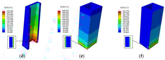 The SP temperature distribution contour plot at a randomly selected moment 205 s of the stable stage is plotted in Figure 4. Figure 4a shows the fire inside the pylon column, with smoke flowing from the bottom to the top. The fire position is located at the bottom of the pylon with high temperature. The fire has a greater impact on the inside of the pylon column and a smaller impact on the outside. Figure 4b is an external pylon fire that is relatively open. The flames wrap the outer ring of the pylon pillar in a ring, and all sides of the pylon pillar are overheated. The pylon column is wrapped in a ring of flame, and all sides of the outer surface are overheated. The smoke flows from the bottom to around. Similar to Scenario I-1, the temperature at the bottom of the pylon as the burning position is higher. In contrast to Scenario I-1, fire has a greater impact on the outside of the column but a smaller impact on the inside. Figure 4c is also an open external fire, which occurred on one side of the column. Smoke diffuses from the bottom of the pylon toward the surrounding column. Similarly, one side at the bottom of the pylon is where the fire burns and the temperature is higher. Different from other scenarios, the fired surface of the pylon column is greatly affected, and the unfired surfaces are slightly affected.