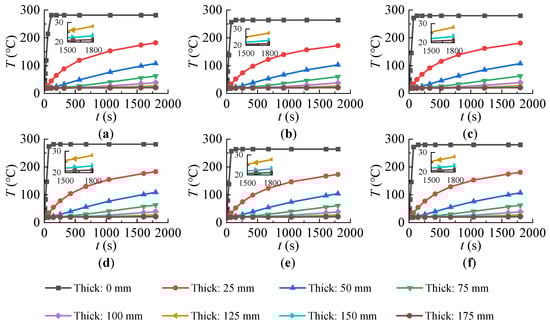 Temperature curves at different thickness: (a) I-1, (b) II-1, (c) III-1, (d) I-2, (e) II-2, and (f) III-2.