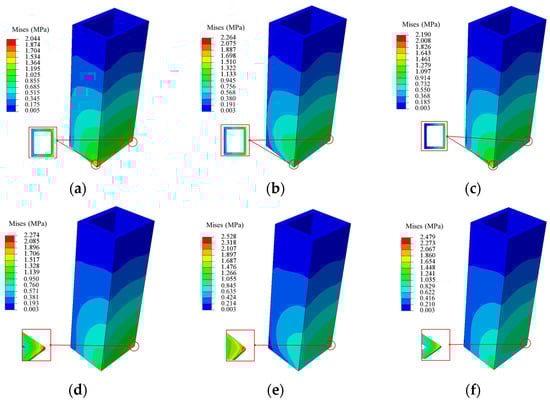 In Scenario I, due to internal fire, the concrete at high temperatures undergoes deformation, which compresses outward and affects the external concrete. The stress distribution patterns are shown in Figure 11a,b. In Scenarios II and III, due to an external fire, deformations occur only within the range affected by temperature, leading to the stress distribution patterns shown in Figure 11b,c,e,f. In particular, the stress concentrations in Figure 11e,f are not generated at the outermost layer but at a thickness of 100 mm. In general, the stress distribution gradually decreases from bottom to top due to the influence of the temperature field. The stress value of the facing-fire side is greater than that of the back-fire side. Under the same scenario, the maximum stress of the MP is generally greater than that of the SP.