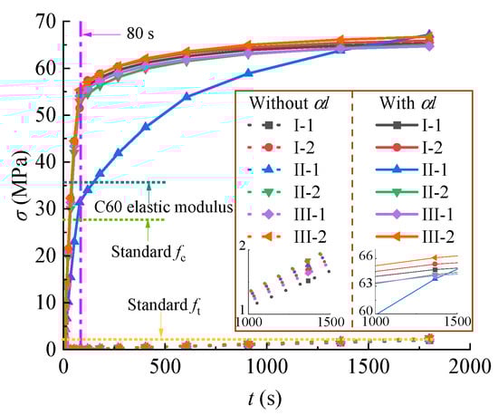 The above analysis did not consider the thermal expansion coefficient parameter αl. When considering the αl value of concrete as 1.05 × 10−5 °C−1 [], the stress value of the pylon columns increases exponentially, as shown in Figure 12. The stress value of concrete has changed from linear to nonlinear, and the maximum value has increased by about 27.5 times. The stress value rapidly increased in the first 80 s and then stabilized. In particular, the stress value on the overheated surface is the highest, far exceeding the standard compressive strength value of 27.5 MPa. Therefore, the calculation of the expansion coefficient is more conducive to fire protection design.