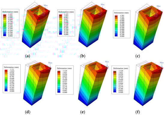 Deformation distribution: (a) I-1, (b) II-1, (c) III-1, (d) I-2, (e) II-2, and (f) III-2.