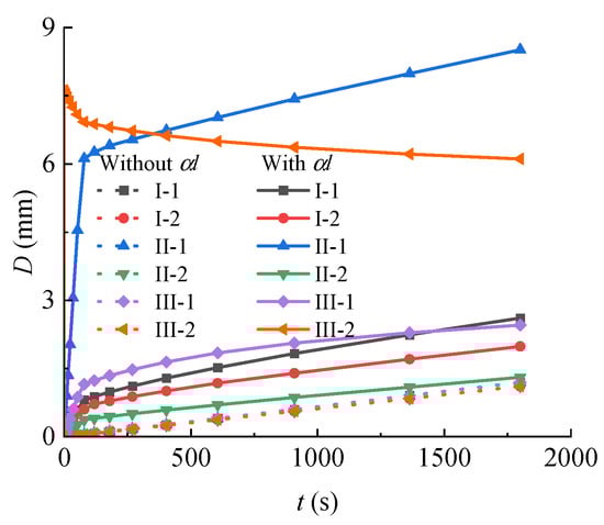 Figure 14 shows the displacement values of the pylon columns considering the thermal expansion coefficient. It indicates that the sensitivity of deformation to thermal expansion coefficient parameters is weaker than that of stress changes, and the deformation is 1–8 times the original value. The deformation trend is basically consistent with the change in stress value, showing a non-linear form of first fast then slow. Scenario II-1 of the SP and Scenario III-2 of the MP have the highest deformation. It is worth noting that Scenario III-2 exhibits deformation and retraction. The steel reinforcement and concrete deform harmoniously together.