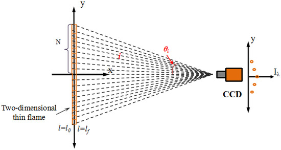 Under this condition, because the flame was very thin, it was reasonable to assume that the radiation intensity emitted from the inside of the flame (at the position between l0 and lf in Figure 1) along the ray i was approximately the same and homogeneous. Therefore, the radiation intensity emission along the ray i could also be simplified as follows: