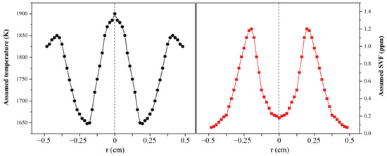 Figure 2 displays the assumed input temperature and soot volume fraction distributions, which were adopted from the actual experimental results of Ref. [32]. The temperature and soot volume fraction usually exhibit opposite trends, which has also been observed in Ref [7]. The field angle (2θ) between the flame edge and the CCD optical center was assumed to be 20°, and the flame thickness was assumed to be 1 mm. It should be mentioned that the symbol “r” represents the different flame widths in the cross-section of the thin-slice flame.