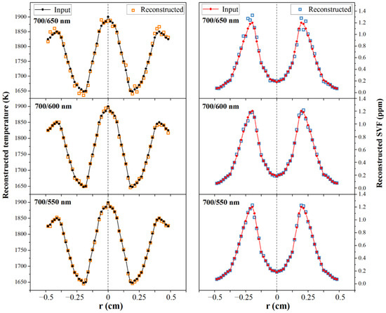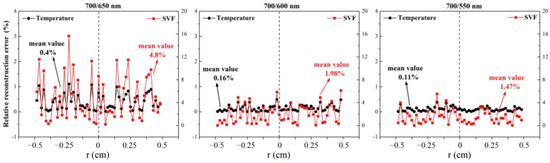 Combined with the detailed error analysis in Figure 4, it could be observed that when 700 nm and 550 nm were used, the mean and max reconstruction errors of temperature were 0.11% and 0.38%, respectively. Meanwhile, the average and largest soot volume fraction errors were less than 1.47% and 5.52%. However, with regard to the combinations of 700/650 nm and 700/600 nm, the reconstruction accuracy was not relatively satisfied, especially when 700/650 nm was chosen. In this case, the average relative errors of temperature and soot volume fraction increased to 0.4% and 4.80%, and the local maximum errors even reached 1.10% and 15.65%, respectively. The reconstruction effect of the wavelength combination of 700/550 nm was the most convincing among the three selected cases. Therefore, the application of 700/550 nm was used for further examination in the following analysis.