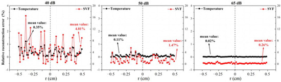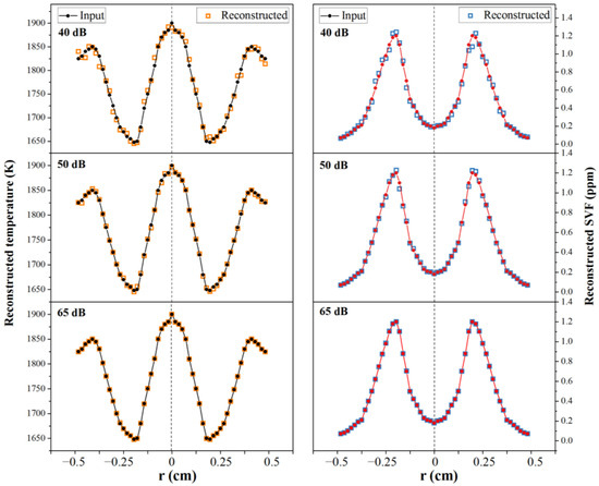 In the present section, the effects of three different measurement errors on the accuracy of the model are investigated, which were σ = 5.62 × 10−4 (SNR = 65 dB), σ = 3.16 × 10−3 (SNR = 50 dB) and σ = 1 × 10−2 (SNR = 40 dB). As exhibited in Figure 5, the reconstructed temperature and soot volume fraction both had a similar distribution to that of the input temperature and soot volume fraction in general. However, as the SNR declined, the reconstructed curves became obviously rough, indicating a worse reconstruction effect. In the error analysis of Figure 6, for the SNR of 65 dB, the mean and max relative error of the reconstructed temperature was 0.02% and 0.06%, respectively. The mean value of soot volume fraction relative errors was 0.26%, where the largest error was 0.83%. The error distribution of every point was almost consistent. With the decrease in the SNR to 40 dB, the reconstruction errors of mean and max temperature increased to 0.35% and 1.22%, respectively. In addition, the average and largest reconstructed soot volume fraction errors rose up to 4.81% and 16.5%, respectively. The range of error distribution fluctuated violently. In conclusion, a great reconstruction effect could be achieved with the SNR reaching 65 dB. It could also be noted that the relative errors of the reconstructed soot volume fraction were much higher than those of temperature, which indicated that the reduction in the SNR affected the accuracy of the reconstruction results of the soot volume fraction more obviously than it did that of the results of temperature. This was mainly because the reconstruction result of the soot volume fraction depended strongly on the accuracy of the reconstructed temperature. According to Equation (10), when there was a small error in the reconstructed temperature field, the model enlarged this error in the reconstructed soot volume fraction.
