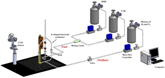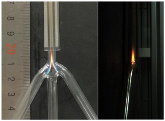 To evaluate the practical application of the reconstruction model above, a series of experiments were conducted on a ψ-shaped meso-scale combustor. As shown in Figure 7, the fuel stream (ethylene) was ejected from the middle inlet channel of the combustor, and the oxidizer stream (air) was transported via the bilateral inlet channels. The flame formed in this combustor could be approximately regarded as a two-dimensional thin flame, which was successfully applied in Ref. [34]. The front and side views of this kind of flame are presented in Figure 8. According to the practical measurements, the flame thickness was approximately 1 mm, and the max flame width was 6 mm. The distance between the CCD and the flame was 10 cm. Therefore, the field angle (2θ) between the flame edge and the CCD optical center was 3.4° and cosθi could be approximated as 1 for all rays.