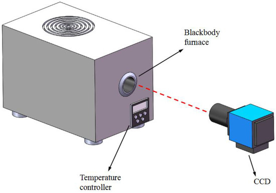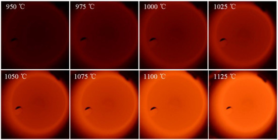 This specific relationship could be acquired via the calibration of the CCD system. As shown in Figure 9, the calibration procedures were as follows. Firstly, we used the blackbody furnace with a known temperature to calculate the released monochromatic radiation intensity Iλ. Then, we allowed the CCD system to shoot this blackbody furnace to obtain the corresponding gray value, Xλ. Therefore, the correlation between Iλ and Xλ could be ascertained via function fitting. During the calibration process, the exposure time and f-number of the CCD system were set to 1/40 s and f-22, respectively. The practical calibrated images are shown in Figure 10.