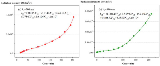 According to chromatic theory, each pixel of the image generated three digital numbers (R, G, and B) which, respectively, represent the spectral responses of the red, green and blue spectral bands for the CCD camera approximately. In the present work, red (700 nm) and green (546 nm) wavelengths were selected as the measurement temperature band because the previous numerical results indicated that the adjacent wavelength combination (700/550 nm) had a high reconstruction accuracy. The polynomials obtained by fitting the values of Iλ (monochromatic radiation intensity) and Xλ (gray value) with R-squares of 0.9985 and 0.9997 are exhibited in Figure 11. After the calibration, the local monochromatic radiation intensity (Iλ) in the flame at two different wavelengths could be determined.