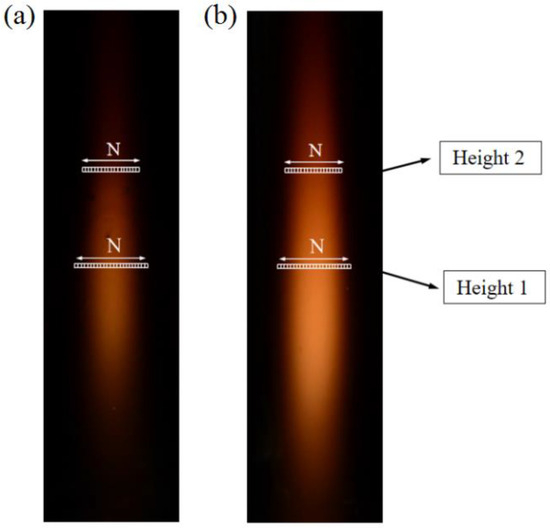 To verify the feasibility of the proposed model, two representative experimental conditions were used for experimental reconstruction. It is worth mentioning that only one image was selected for each working condition because the adopted flame was a steady-state flame, and its morphology would not change with the variation in time. Figure 12 exhibits two representative thin-slice flames for the experimental reconstruction. Figure 12a shows the DME/ethylene flame with a DME fuel flow of 40 mL/min and an ethylene flow rate of 60 mL/min. Figure 12b shows the pure ethylene flame with an ethylene flow rate of 100 mL/min. Combined with the calibration results and the model above, the distributions of temperature and soot volume fraction for typical two-dimensional slice flames at two specific heights can be reconstructed, as shown in Figure 13.