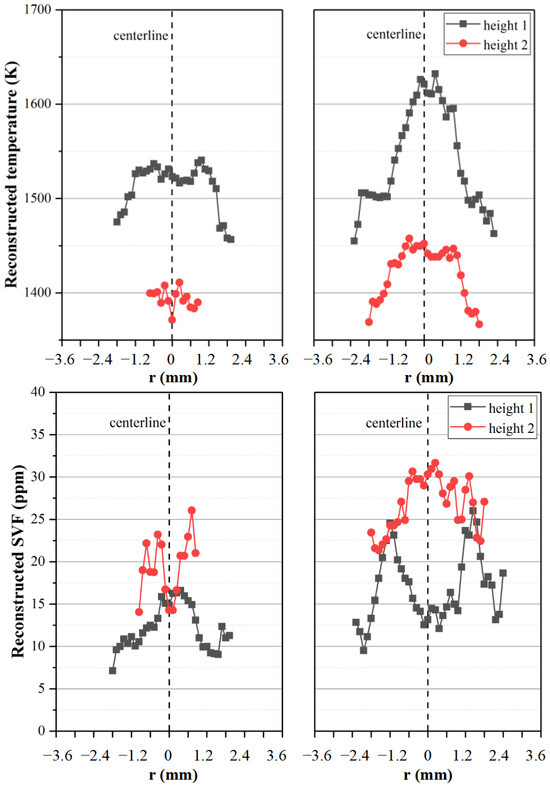 As shown in Figure 13, the reconstructed flame temperature ranged from 1400 K to 1650 K, and the flame temperature in the central area was generally higher than that on both sides. The reconstructed temperature curve of Figure 12b was relatively smooth, and could reflect the law of temperature distribution at both heights well. However, there were some fluctuations in the reconstructed results of Figure 12a, especially at height 2. This was because the brightness of flame (a) was much lower than that of flame (b). The radiation intensity emitted by the flame was stored in the digital image as gray information. Because the gray value could only be expressed as an integer, the larger the gray value was, the more accurate the radiation intensity and the smaller the reconstruction error. Moreover, the reconstructed temperature and soot volume fraction both had good symmetry. The flame temperature at height 1 was higher than that at height 2, but the soot volume fraction had the opposite distribution trend. This result was generally reasonable and had good agreement with previous experiments [27]. The reconstruction result successfully indicated that the flame with a large DME addition had apparently lower combustion temperatures and soot volume fractions, which was consistent with the practical combustion situation [35]. Through the analysis above, the reconstructed result of the proposed model had good reliability and could reproduce the actual combustion condition.