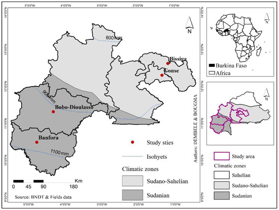 Open agricultural biomass-burning experiments were conducted in two climatic zones of Burkina Faso: the Sudanian and Sudano-Sahelian zones. Four experimental sites were selected with two sites per climatic zone located between 9°50′ and 13°70′ N latitude and 00°10′ and 5°80′ W longitude (Figure 1). The precipitation pattern in both climatic zones is unimodal, with a prolonged dry season from November to April, followed by a short-yet-intense rainy season from May to October. According to climate data from the National Meteorology Agency of Burkina Faso, the Sudanian zone recorded a mean annual rainfall of 1153.48 ± 203 mm and a mean temperature of 28.15 ± 0.25 °C during the last decade (from 2013 to 2022). In the Sudano-Sahelian zone, mean annual rainfall and temperature values recorded during the same period were 900.40 ± 67 mm and 29.41 ± 0.22 °C, respectively. Subsistence agricultural activities are the main occupation in the study area and account for approximately 56.2% of the total population [25]. Cropland landscapes are characterized by cropland remaining cropland (old croplands) and land converted to cropland (young croplands) with major agroforestry species such as Vitellaria paradoxa C.F.Gaertn., Parkia biglobosa (Jacq.) Benth. and Lannea macrocarpa Engl. and K. Krause for the Sudanian zone and Vitellaria paradoxa, Parkia biglobosa, Lannea macrocarpa, Sclerocarya birrea (A. Rich.) Hochst. and Tamarindus indica L. for the Sudano-Sahelian zone [26]. Due to the growing demand for arable land, the expansion of agriculture through forest clearance is the main driver of deforestation in the study area [27]. Annual field clearing using biomass burning is generally carried out at the end of the dry season between April and May. Field clearing includes traditional slash-and-burn methods to clear plant biomass (shrubs, plant regeneration and crop residues).