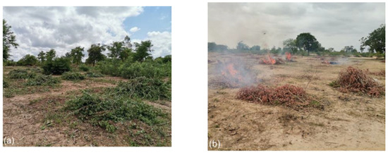 Figure 3. Cropland clearing according to farmers’ practices: (a) biomass slashed and piled in cropland converted to cropland, (b) fire ignition for biomass burning.