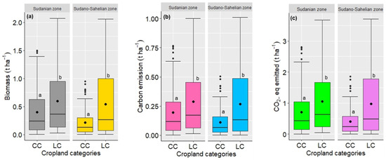 Figure 5. Variability in biomass, carbon emitted and carbon dioxide emitted across cropland category (CC: Cropland Remaining Cropland; LC: Land Converted to Cropland) per climatic zone in Burkina Faso. The median and mean are represented by a horizontal line and a dot in the box plots, respectively. Different letters above the boxes indicate significant differences between cropland categories for each climatic zone (p < 0.05).