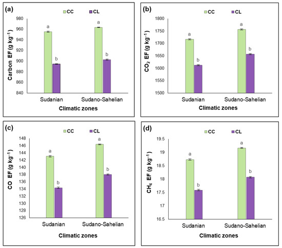 Figure 6. Emission factors (g kg−1) of C (a), CO2 (b), CO (c) and CH4 (d) (mean ± SE) of LC and CC in the two climatic zones during the fire experimentation. Different letters above the bars indicate significant differences between cropland categories for each climatic zone (p < 0.05). Error bars show standard errors.