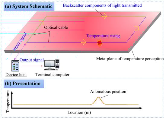 The technology of distributed optical fiber temperature detection is achieved through Raman scattering [,]. Figure 1 shows the technical principle of the distributed optical fiber temperature sensing system (DTSS), which mainly includes a device host, a terminal computer, optical cables for temperature measurement, and a meta-plane of temperature perception.