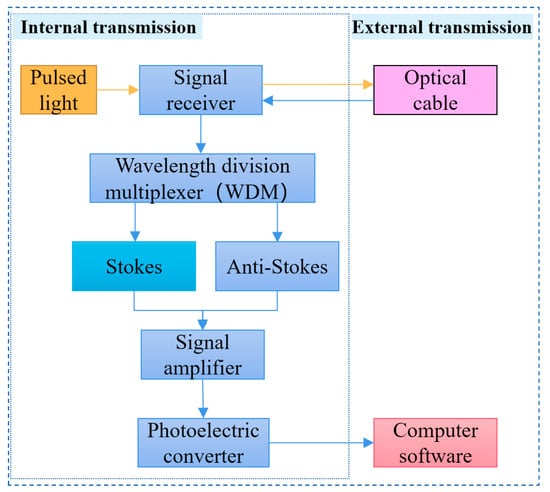 Figure 2 shows the demodulation process of DTSS. The laser pulse is emitted by a laser with a high-power semiconductor. The laser pulse entering the external optical cable generates back-scattered optical signals and transmits them back to the signal receiver. Next, a wavelength division multiplexer (WDM) separates the temperature-insensitive Stokes light and temperature−sensitive anti−Stokes light from the back−scattered light, and amplifies their gain through a signal amplifier. A photoelectric converter demodulates the temperature information carried by the light into electrical signals, and finally, outputs them to an external computer [,].
