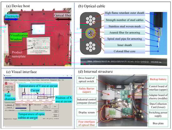 In this work, a new DTSS technology that can be used in coal mine gob is proposed [,]. Figure 3 shows the complete DTSS set. Figure 3a illustrates the fiber optic device host. The left side of the device host is the power supply, the right side is the signal transmission interface, and the screen in the middle of DTSS is a visualization window that can directly display the detected temperature data. Figure 3b illustrates the optical cable used for temperature measurement. The design of a flat appearance increases the temperature detection area; the design of parallel steel cable reinforcement enables the optical cable to have very strong compressive and impact resistance. Figure 3c illustrates the software interface displayed in the visualization window, which can display the position and temperature values of a certain point on the optical cable. The horizontal axis of the coordinate map represents the length of the optical cable, and the vertical axis represents the temperature value detected by the optical cable. Figure 3d illustrates the internal structure of the detection host, where the device has added safety barriers and backup batteries to improve safety performance and prevent the impact of power outages. In addition, the bias plate component used can conduct small signals and improve the signal−to−noise ratio.