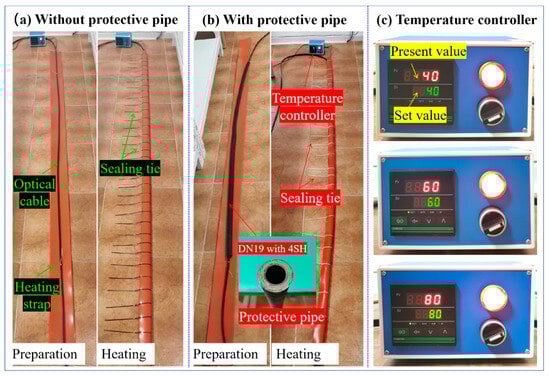 The test design is shown in Figure 4. A silicone flexible electric heating film connected to a PID temperature controller is used as the heating strap for better contact and transfer of heat to the optical cable. The heating strap that wraps around the optical cable is fixed with several sealing strips. A DN19 high−pressure rubber hose with four layers of steel wire winding reinforcement was selected as the protective pipe. The protective pipe can fully meet the requirements for use on gob, with a maximum working pressure of 42.0 MPa and a minimum blasting pressure of 168.0 MPa.