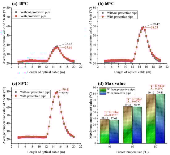 Figure 5 indicates the changes in temperature values detected without and with the protective pipe. The horizontal axis is the length of the optical cable, and the vertical axis is the average temperature value of five tests. From Figure 5, the maximum detection temperature values for the three preset temperatures (40 °C, 60 °C, and 80 °C) without the protective pipe are 38.48 °C, 59.42 °C, and 79.27 °C, respectively. After using the protective pipe, the maximum detection temperature values for the three preset temperatures are 37.21 °C, 58.75 °C, and 79.41 °C, respectively. The differences between the two experiments are 0.87 °C, 0.67 °C, and 0.24 °C, and neither of them exceed 1 °C, as shown in Figure 5d. And the trend of their temperature changes is consistent, which indicates that the influence of the protective pipe on the temperature value is very small and can be ignored.