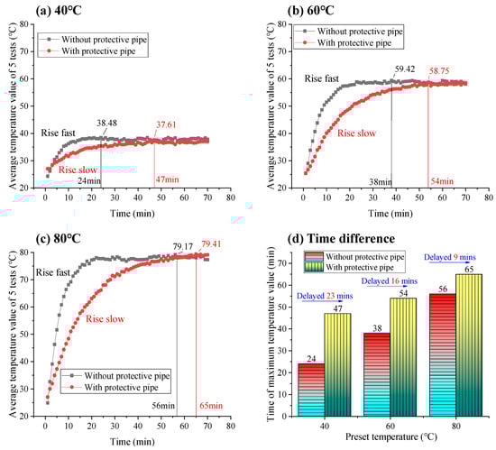 Comparison of temperature sensing speed without and with protective pipe. (a) 40 °C. (b) 60 °C. (c) 80 °C. (d) Time difference.