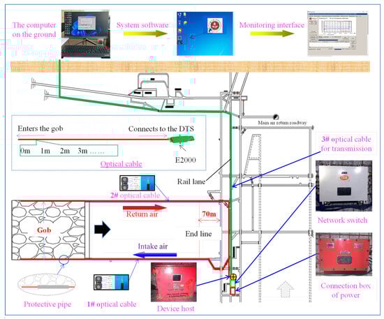One end of the optical cable with an E2000 fiber optic connector enters the device host. And as the working face advances, the other end, beginning a 0 m, is buried in the gob. The connection box of power supplies power to the device host. The temperature signal demodulated by the device host is transmitted to the ground computer through a network switch and the 3# transmission optical cable, which achieves the ground monitoring of temperature data in the underground gob.
