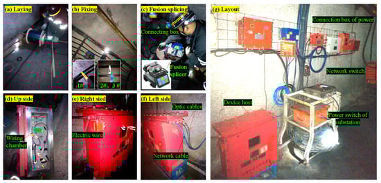 Figure 8 shows the construction of each part of the DTSS on-site, and Figure 8a,b show the laying of optical cables with identification labels on them. Subsequently, the wiring work is completed using a fusion splicer. The connection of optical cables, electric cables, and network cables to the device host is completed in the wiring chamber shown in Figure 8d. The on-site layout of the DTSS is shown in Figure 8g.