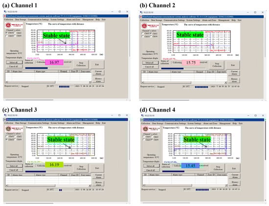 After the completion of the DTSS, the system software of the ground computer obtains temperature data from four channels, as shown in Figure 9. The optical cables used in this work are dual-mode with two cores (double insurance), so channel 1 and channel 2 display the temperature data of the 1# optical cable, while channel 3 and channel 4 display the temperature data of the 2# optical cable. The temperature data detected by the four channels has a certain degree of fluctuation, but the difference is not significant, and the temperature on the entire optical cable remains stable. Real-time data show that the temperature of the gob is between 15.45~16.97 °C, with an average value of 16.09 °C. It should be noted that there is an irregular fluctuation in temperature at the end of each channel, which is a normal disturbance phenomenon at the end of the optical cable and can be ignored.