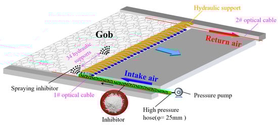 To control the increase in temperature after receiving the warning information issued by the DTSS, the method of using spray inhibitors in the gap between the hydraulic supports was employed to suppress the oxidation reaction of residual coal. Figure 10 shows the spraying process of the inhibitor solution. The inhibitor is industrial calcium chloride (CaCl2·5H2O), with a concentration of 15%. The mixed inhibitor solution was delivered to the working surface through a pressure pump of model BZ-40/2.5 (manufactured by Shandong Changye Machinery Equipment Co., Ltd., China), and then, sprayed though a spraying gun from the gap between two hydraulic supports towards the gob, for at least 6 min each time, with a flow rate of no less than 35 L/min. Due to the temperature anomaly point detected by the 1# optical cable being close to the air intake side, inhibitor spraying was designed to be carried out at 60 m (34th hydraulic support) on the air intake side.