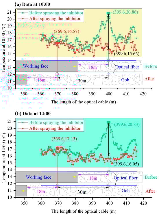 The working face advanced by 30 m within 65 days from 26 June 2023 to 31 August 2023. The effectiveness of the inhibitor solution was evaluated through temperature changes monitored by the 1# optical cable of the DTSS. Figure 11 shows the temperature values of the gob on the air intake side. In order to improve the reliability of data comparison, temperature data from 10:00 am, 14:00 pm, and 20:00 pm one day before and after spraying were selected. The data before spraying were selected from 26 June 2023, and the data after spraying were selected from 31 August 2023.