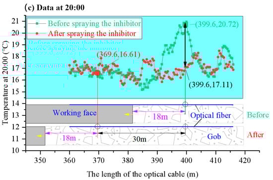 What can be seen from Figure 11 is the following: ① Before spraying the inhibitor solution, the temperature of the gob at the position 18 m behind the working face (optical cable length 399.6 m) increased to 20.86 °C, 20.83 °C, and 20.72 °C, respectively. After using the inhibitor solution, the temperature of the gob with a relative delay of 18 m (cable length 369.6 m) was 16.57 °C, 17.13 °C, and 16.61 °C, respectively, decreasing by 4.29 °C, 3.7 °C, and 4.11 °C, respectively. The average temperature decreased from 20.8 °C to 16.77 °C, with a decrease of 19.38%. This means that the temperature of the gob behind the working face returned to a normal temperature. ② After 65 days of advancing the working face, the point at 399.6 m of the optical cable changed from 18 m to 48 m behind the working face, and the temperature at this position also decreased to 16.05 °C, 15.66 °C, and 17.11 °C, respectively. The average temperature at this point decreased from 20.8 °C to 16.27 °C, with a decrease of 21.78%. This indicates that the risk of coal spontaneous combustion in this area was eliminated. ③ These temperature changes indicate that the adopted inhibitor spray measures effectively suppressed the oxidation and exothermic effect of residual coal, and the DTSS used strongly supports the safety of production work in the coal mine.