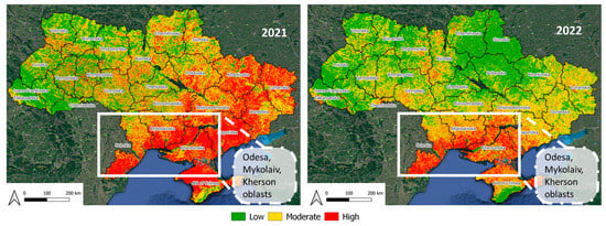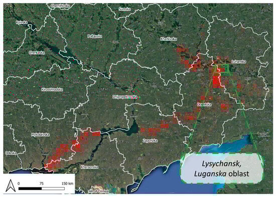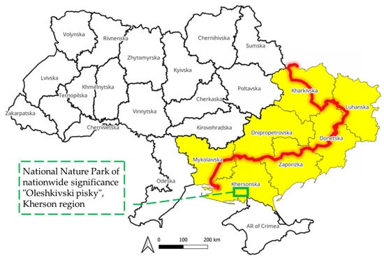 In this study, fire identification was conducted during the summer months of 2022. The MODIS data were used to identify all fire hot-spots for the entire territory of Ukraine. For the areas where military operations are taking place (Figure 1, yellow regions—Kharkivska, Luhanska, Donetska, Dnipropetrovska, Zaporizka, Khersonska, and Mykolaivska oblasts), the fire boundaries were specified for 15–17 July 2022 based on Sentinel-2 data, and the areas of damage were determined by different land cover types. Special attention was paid to the natural ecosystem area near the National Nature Park of nationwide significance “Oleshkivski pisky”, Kherson region (Figure 1, green box), where approximately 1.5 thousand hectares were burned in August 2022.